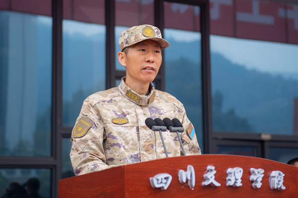 12月2日上午,我校2025级新生军训开训式在莲湖校区田径场举行。学校党委书记黄涛出席开训式并授旗,校长侯忠明作动员讲话,市委常委、达州军分区大校副司令员王爱民宣布军训开训,达州军分区战备建设处上校处长姜新生出席并讲话。开训式由党委副书记徐晓宗主持。